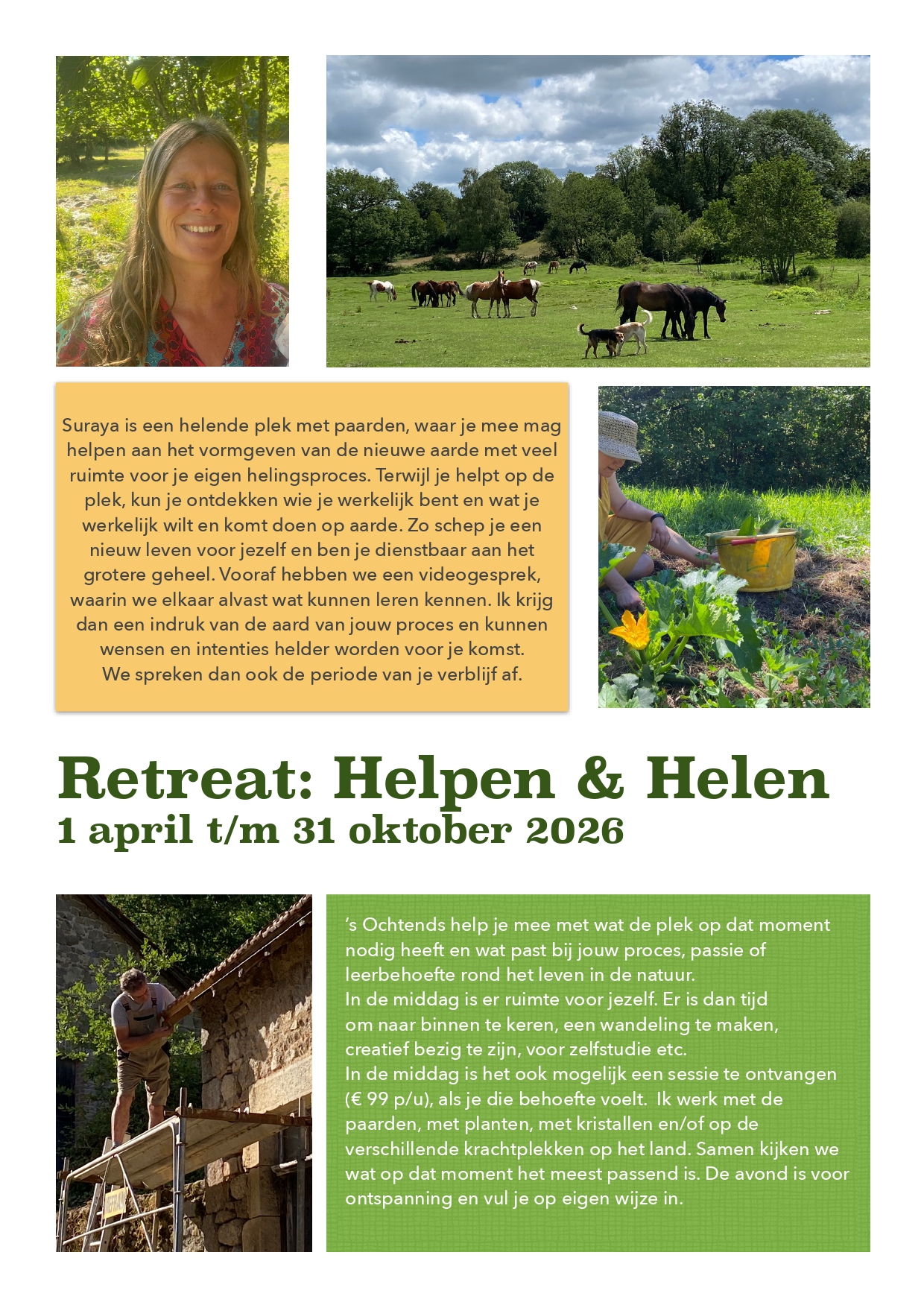 In de periode 1 april t/m 31 oktober is het mogelijk om minimaal twee weken met je zelf in een helingsproces te stappen en te helpen waar het je proces ondersteunt.