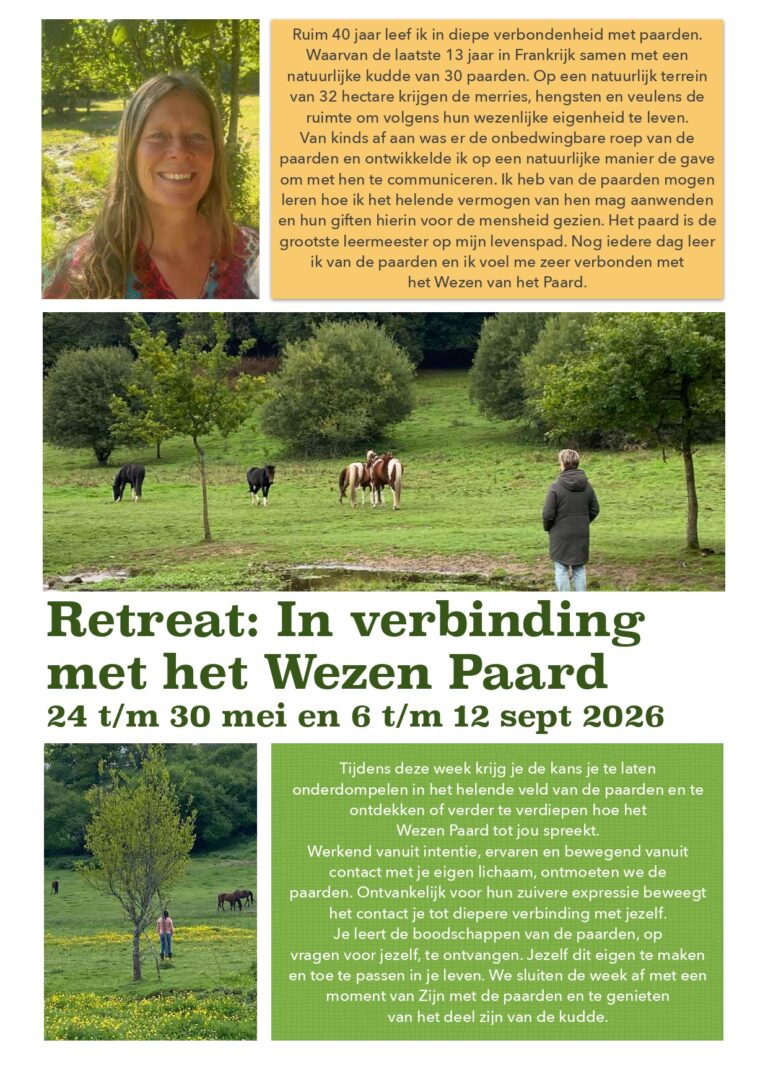 In samenwerking met mijn paarden met wie ik al vele jaren samenleef is de Retreat : In verbinding met het Wezen Paard ontstaan.