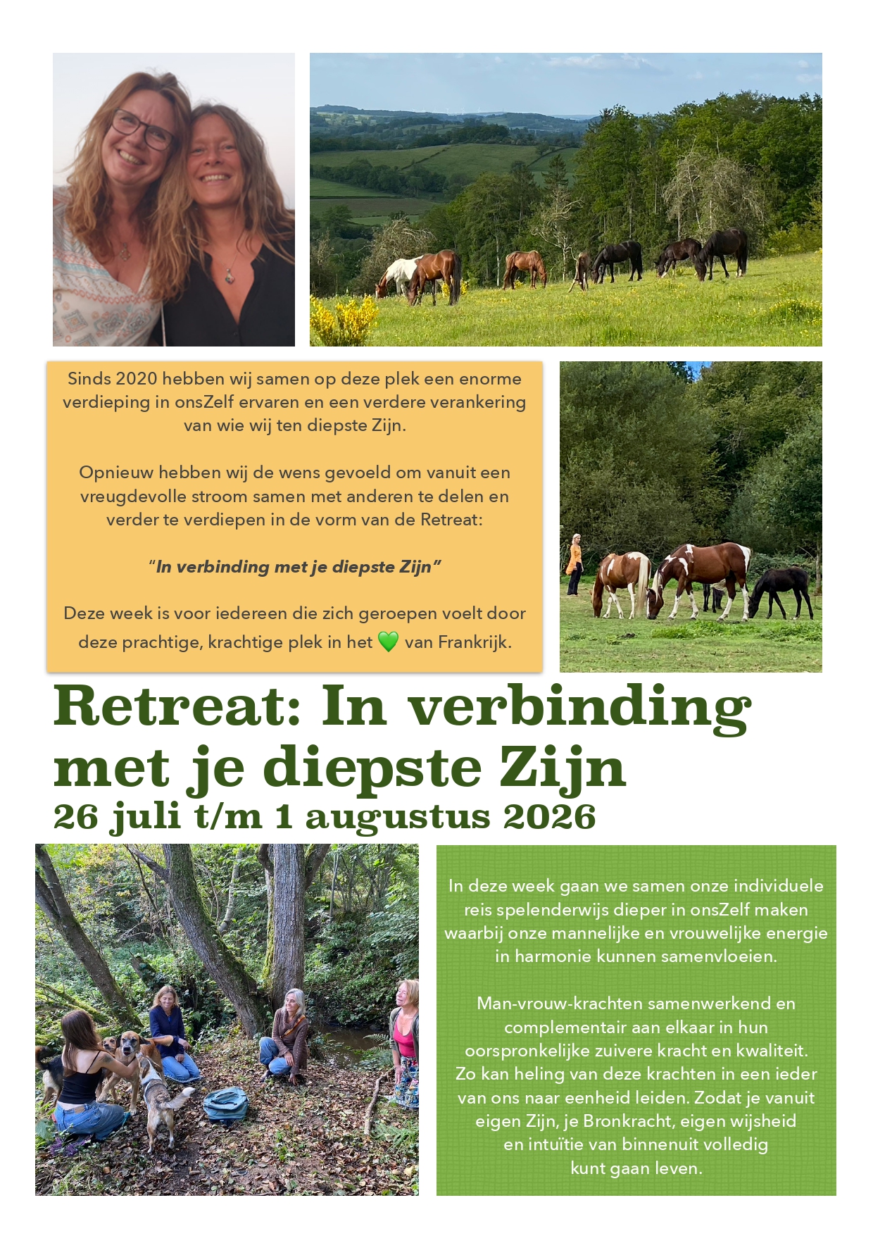 In samenwerking met Nelleke Mutsaers-Kappers met wie ik al veel bewustzijnwerk in vele vormen heb gedaan is de Retreat: In verbinding met je diepste Zijn ontstaan.